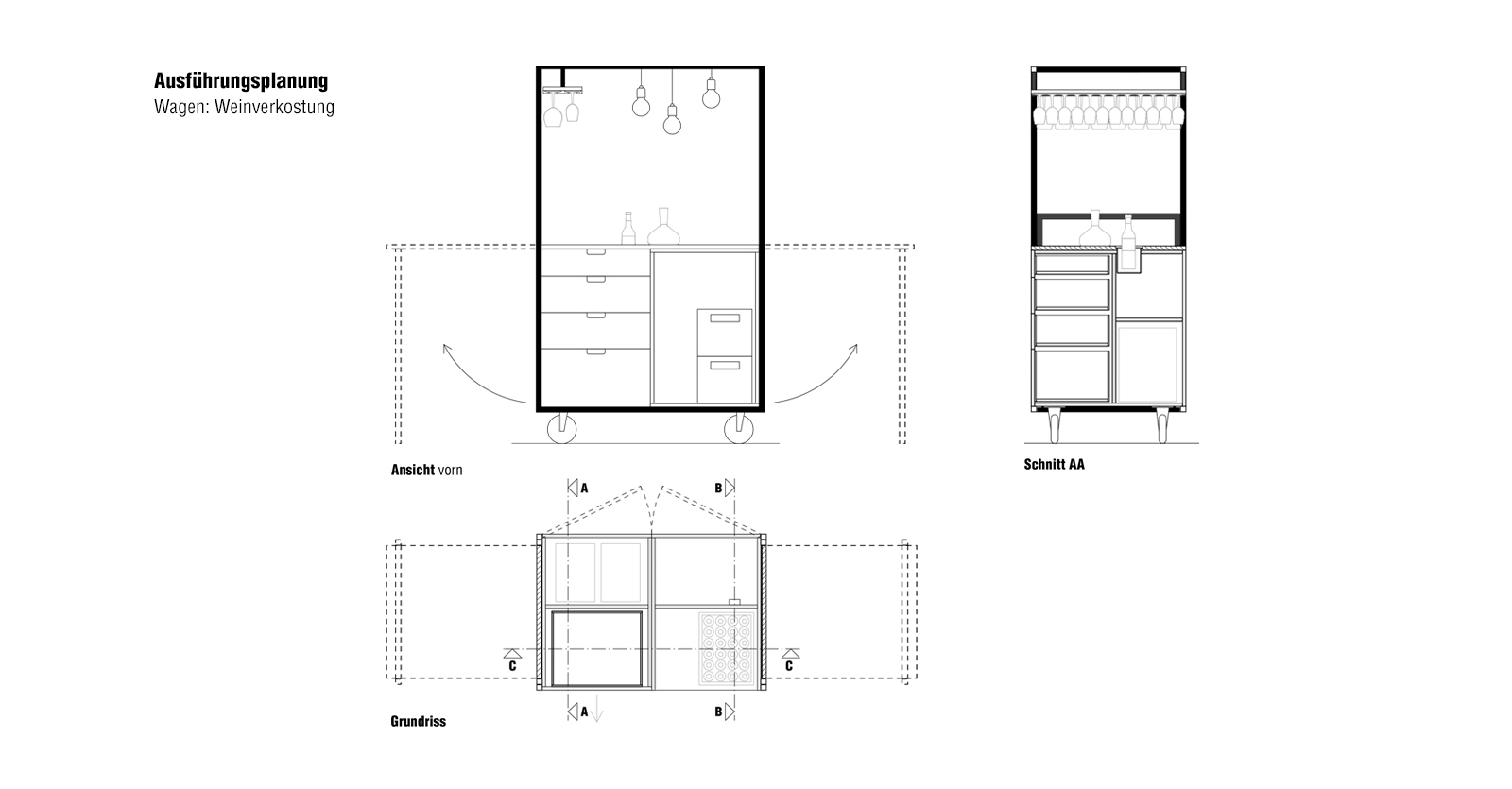 Zentrales Element sind mobile Wagen aus schwarz pulverbeschichtetem Stahl mit Multiplex- und Eichenoberflächen. Sie strukturieren Veranstaltungen flexibel und werden bei Nichtgebrauch ausgelagert. Gelbe Stühle, weiße Tische und farbige Leuchtenkabel setzen gezielte Akzente innerhalb der ansonsten zurückhaltenden Materialität. Auch das Lichtkonzept ist variabel angelegt und ermöglicht durch Schalten und Dimmen unterschiedliche atmosphärische Situationen.