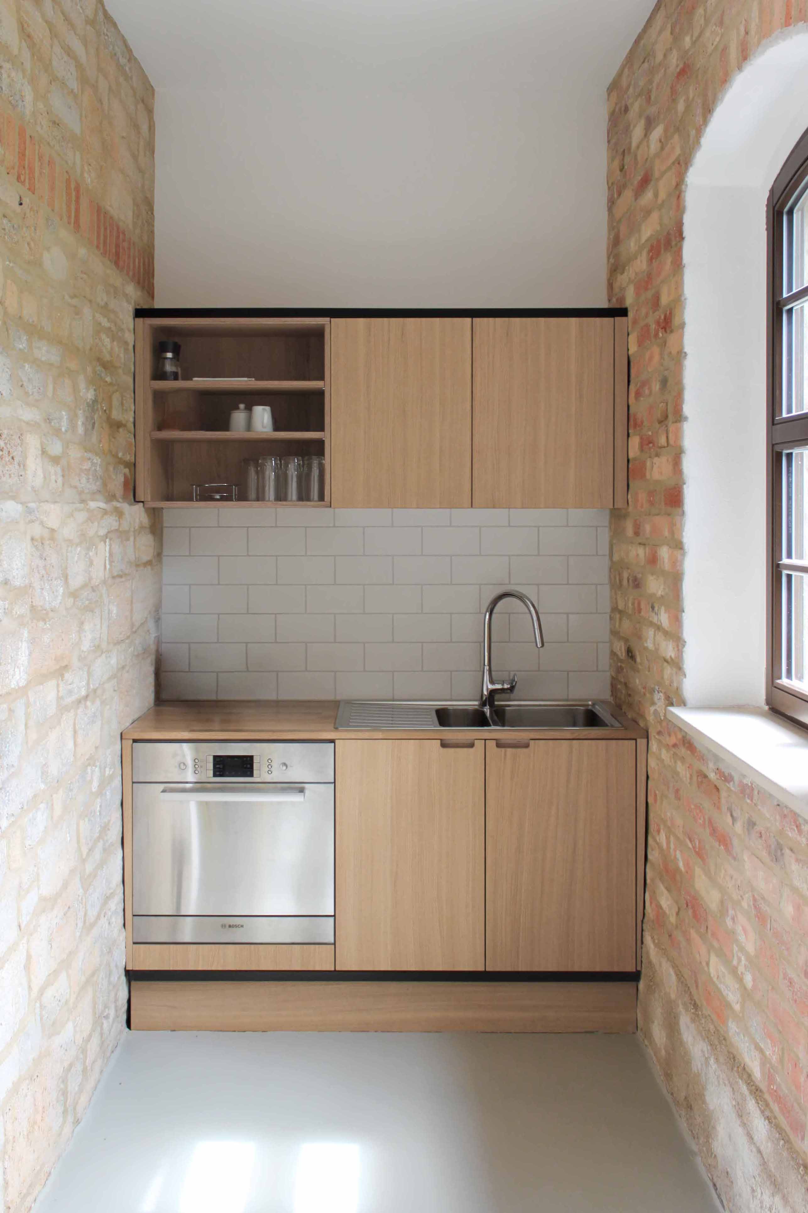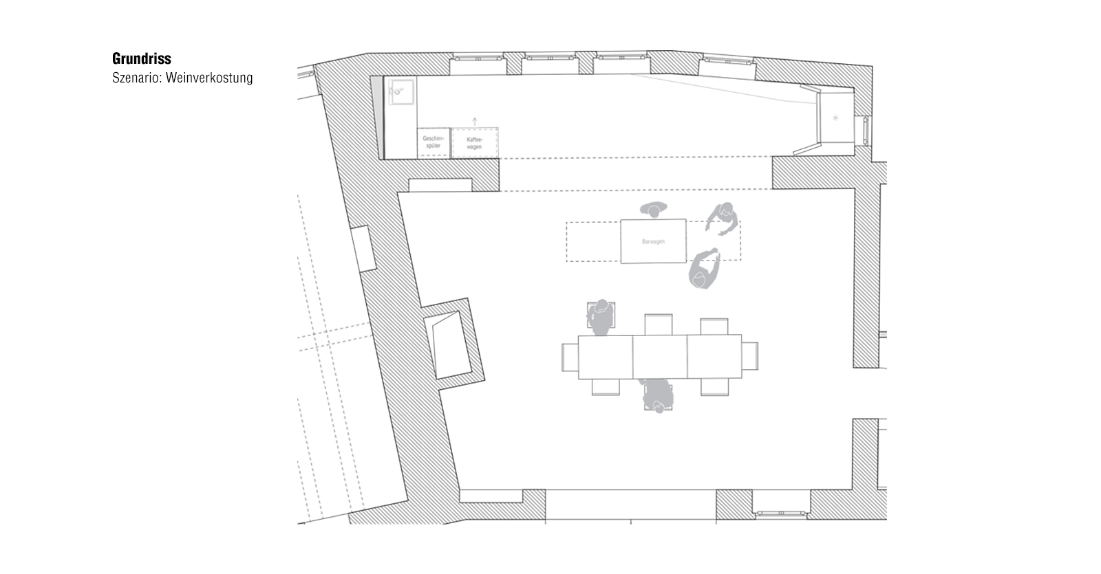 Der Entwurf setzt auf einen bewussten Umgang mit der vorhandenen Substanz. Unregelmäßiges Mauerwerk bleibt sichtbar, großflächige weiße Bereiche schaffen Ruhe und dienen als neutraler Hintergrund für wechselnde Formate. Eine neu eingefügte Fensterfront an Stelle des ehemaligen Tores öffnet den Raum, stärkt Blickbeziehungen und verbessert die Belichtung.